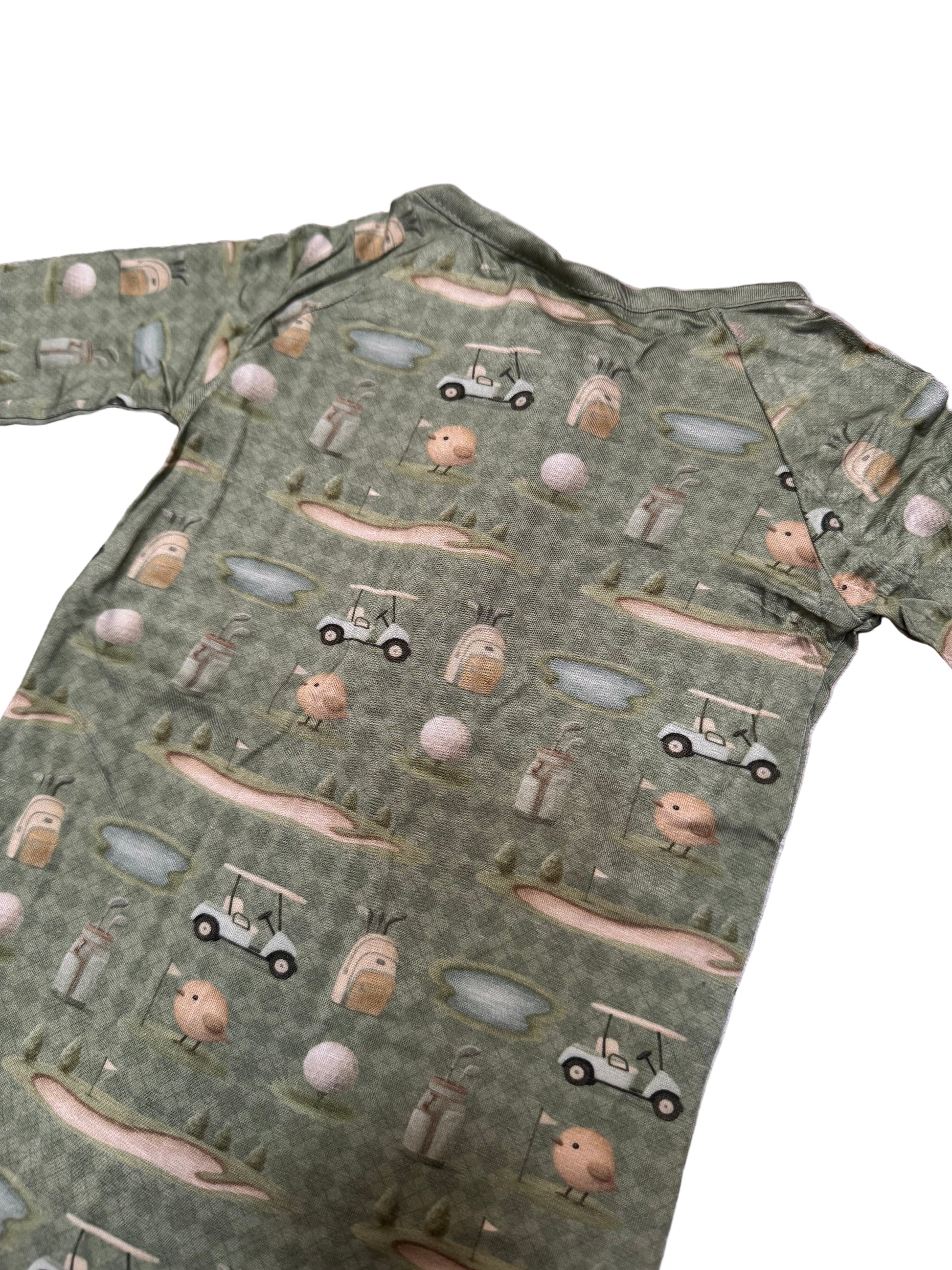 Tee off bedtime in style with this golf themed bamboo zippered sleeper for your rising star. Set against a soft argyle green background, this sleeper is crafted from ultra-soft, breathable bamboo fabric that’s gentle on sensitive or eczema prone skin. A full-length dual zipper makes for quick changes, while foldable cuffs provide a grow-with-me fit. A hole-in-one for golf loving families!