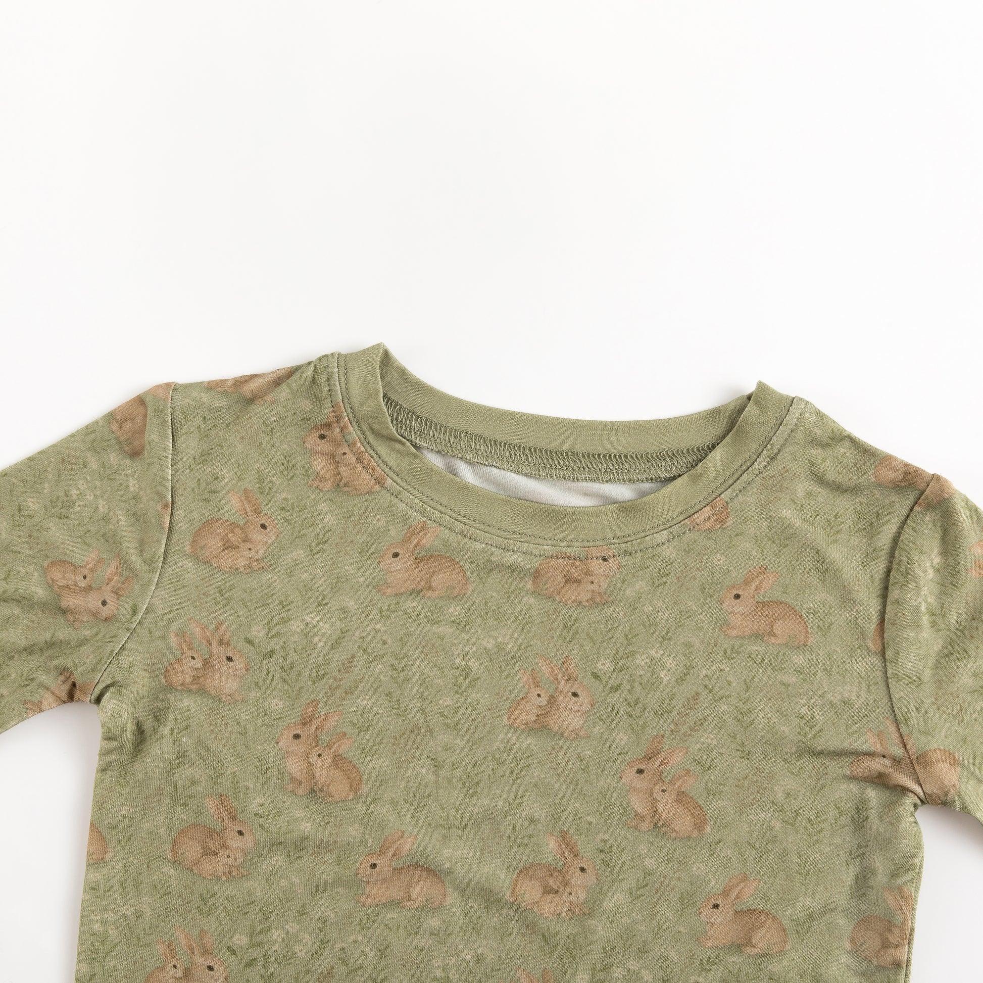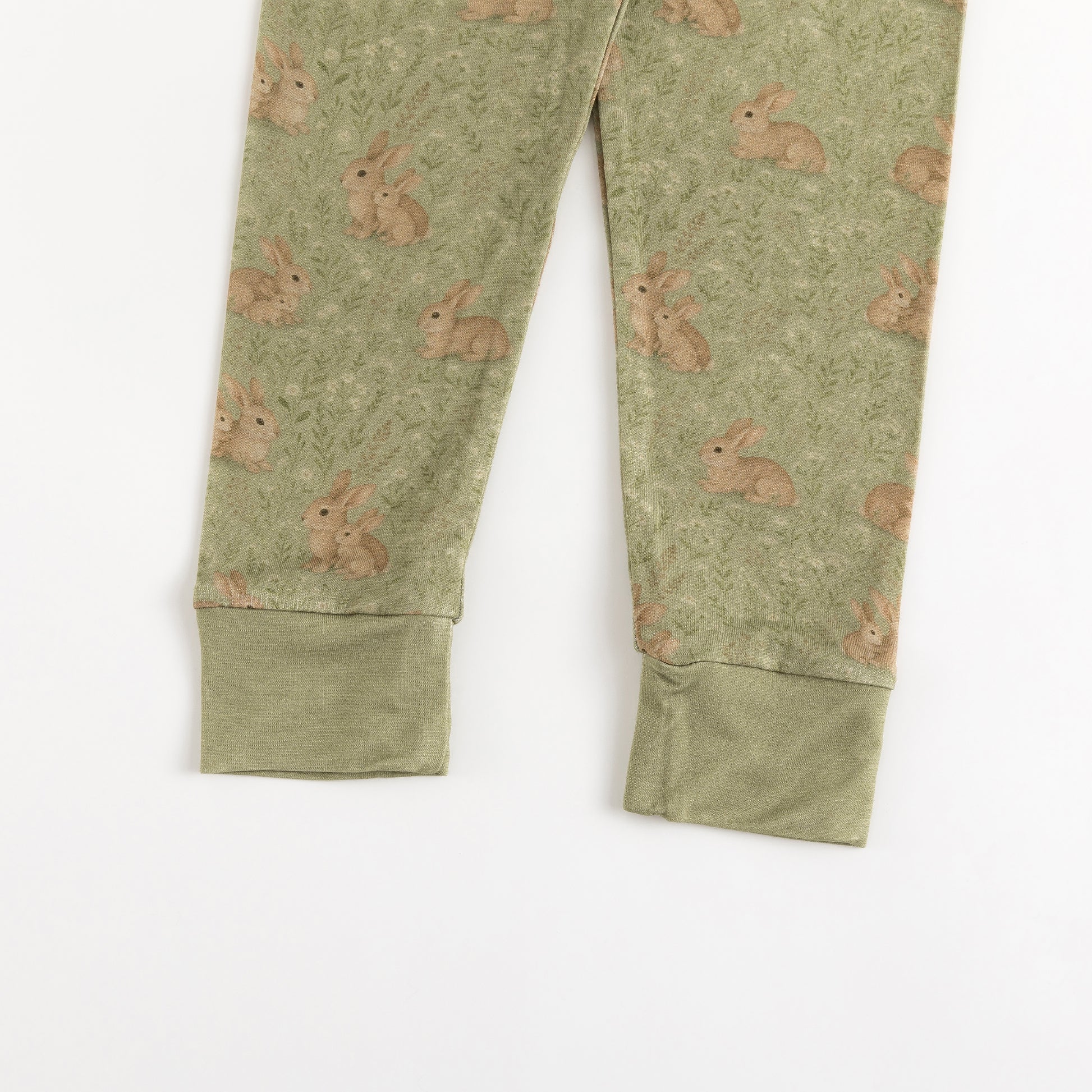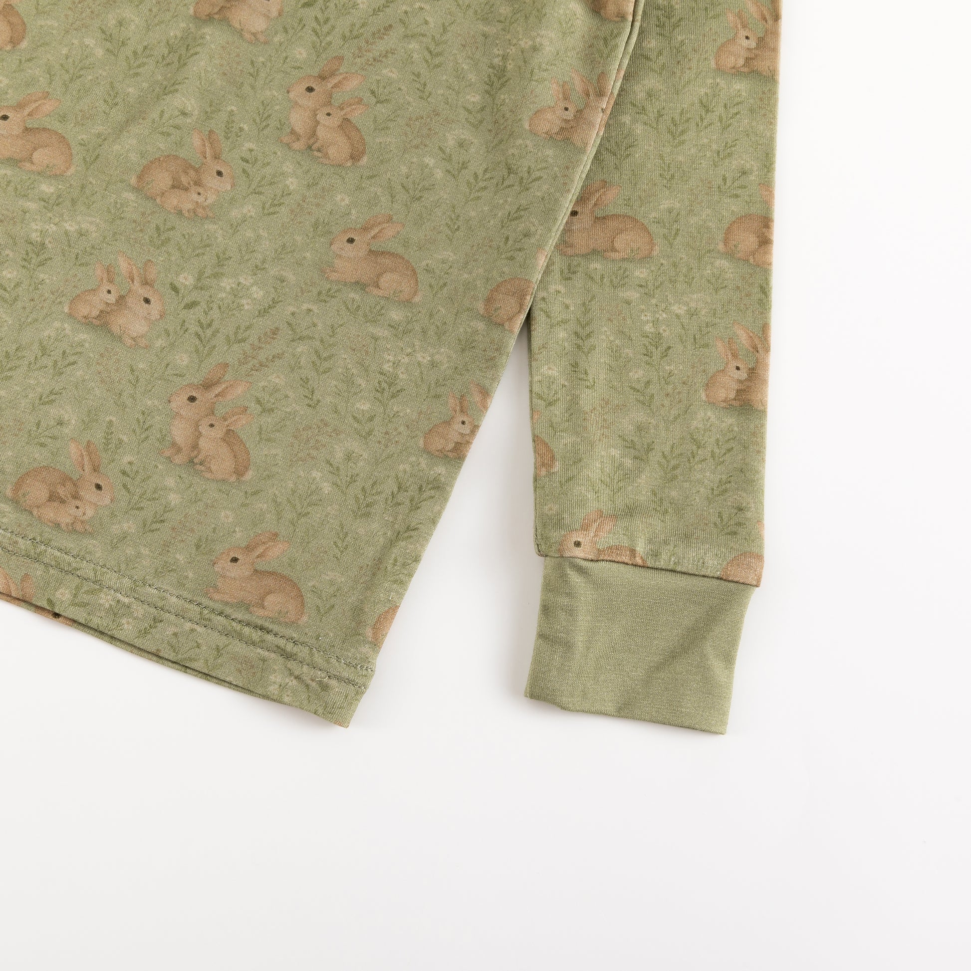 This sage green bamboo pyjama set features a playful all over bunny print, designed for comfort and style. The long sleeve top and matching pants are crafted from ultra-soft, breathable bamboo fabric that’s gentle on sensitive or eczema prone skin. Naturally temperature regulating and stretchy, this cozy set keeps kids comfortable through every season, from bedtime to lazy mornings.