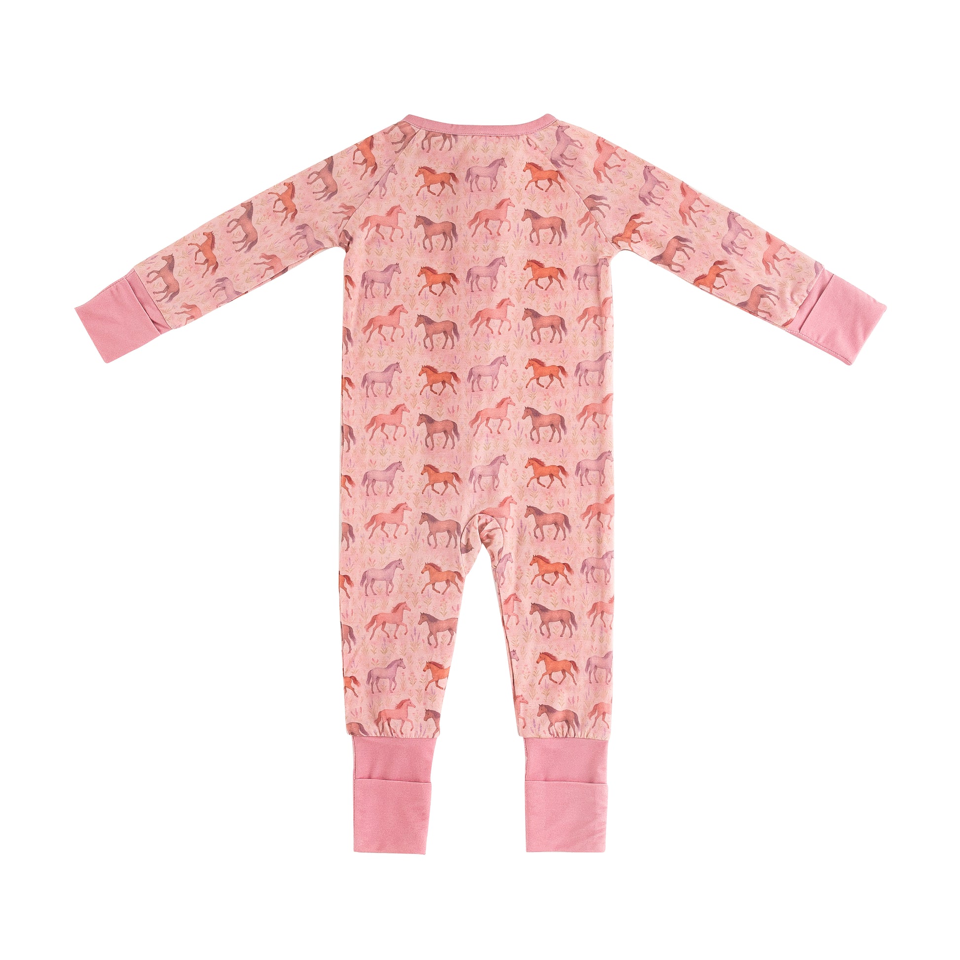 This pink bamboo zippered sleeper features a lively all over horse print, perfect for little ones who love to dream and play. Crafted from soft, breathable bamboo fabric, it’s gentle on sensitive or eczema prone skin while keeping your baby comfortable year round. The full length dual zipper allows for quick changes, and foldable cuffs provide a flexible fit as your child grows.